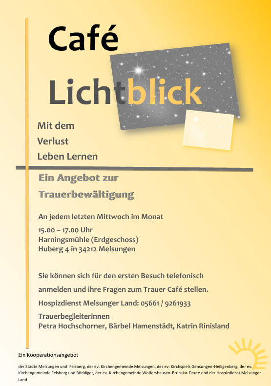 Das Café Lichtblick ist ein unverbindliches, regelmäßiges Angebot an Trauernde jeden Alters, zu dem wir Sie herzlich einladen.